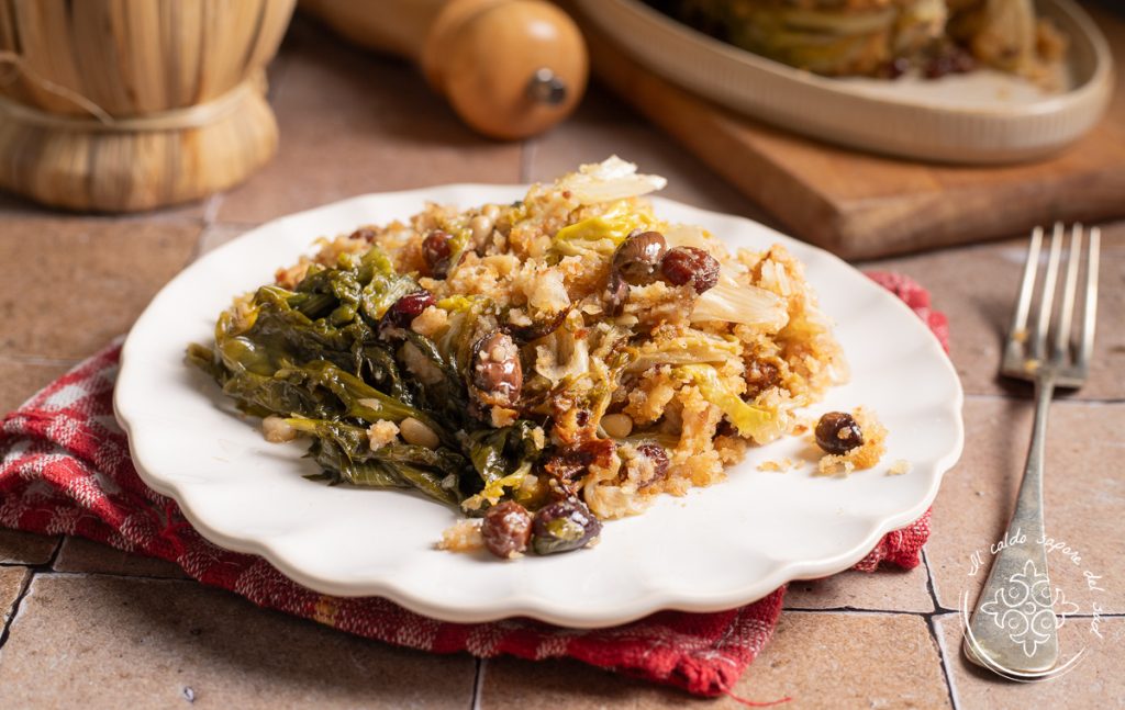 De traditionele gevulde escarole op Napolitaanse wijze is een gerecht dat ontstond als een rijk bijgerecht, maar in de Napolitaanse traditie vaak ook dienstdoet als hoofdgerecht en zelfs als een lichte tweede gang om te combineren met een snee huisgemaakt brood. Ook bekend als scarola ‘mbuttunata, is dit een van die Partenopeïsche recepten die de huiskeuken vertellen: handelingen in een traag ritme, vertrouwde geuren en smaken die geen uitleg nodig hebben. Het is een gevulde escarole in de pan of in de kookpot, eenvoudig en authentiek, bereid met olijven, rozijnen, pijnboompitten, paneermeel en ansjovis, zoals men vroeger in de keukens van het Zuiden maakte.