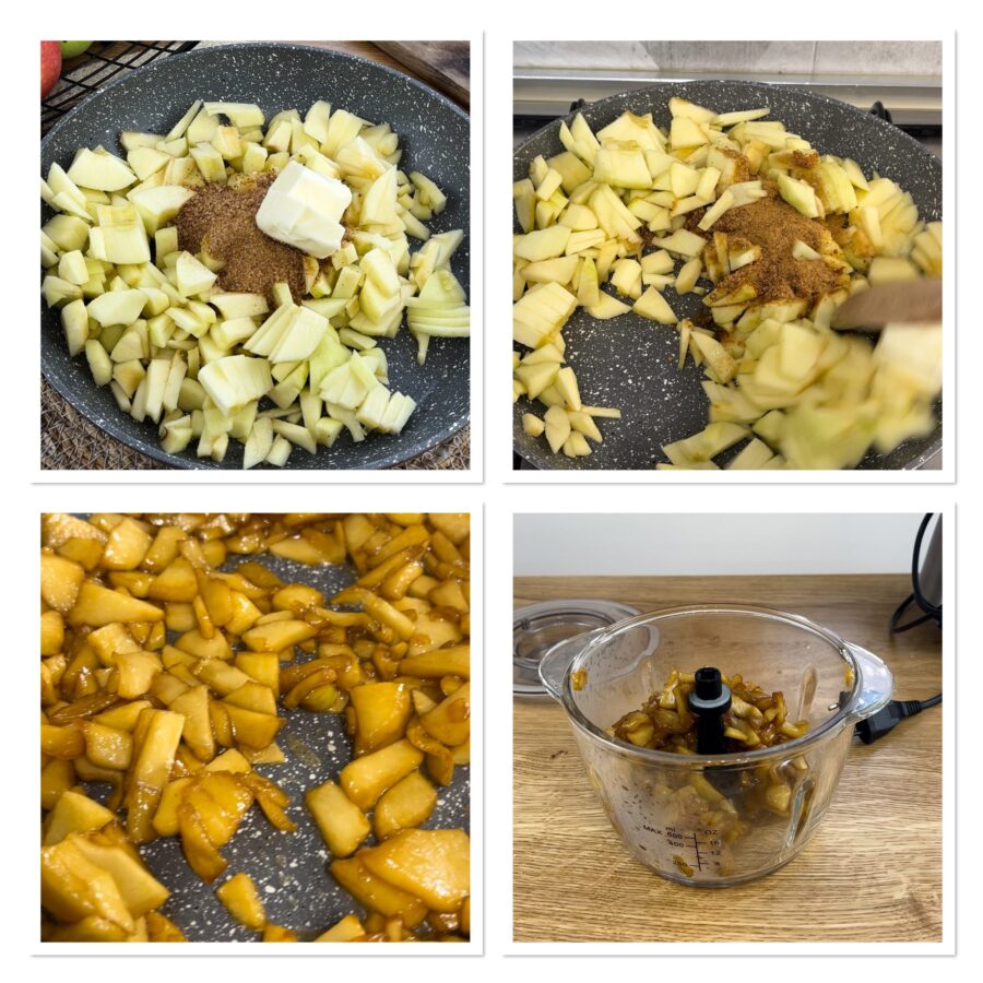 • ze moeten goed droog blijven. Tot slot pureer je ze en doe je ze in een kom, voeg nog wat kaneel toe, de met een mes gehakte walnoten en de citroenschil. Laat afkoelen; terwijl de appels koken raad ik je aan het deeg te maken.