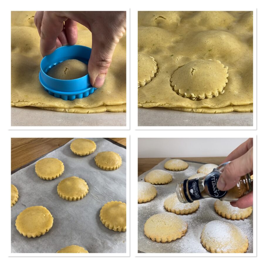 Leg de andere plak erover, dicht de hoopjes vulling in het deeg door licht aan te drukken met je handen en steek de koekjes uit met een uitsteekvorm.