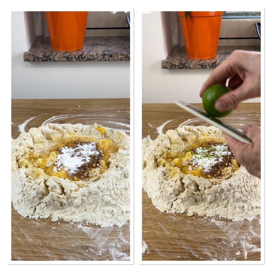 • Stort de bloem op een werkvlak, maak een kuil en voeg de zachte boter toe. Werk tot een zandachtig mengsel, maak opnieuw een kuil en voeg de suiker, het ei en het eigeel toe.