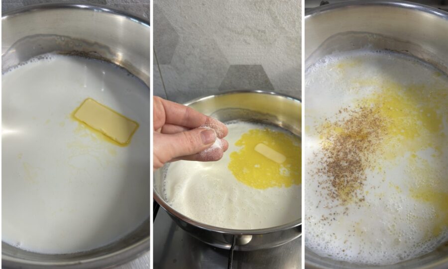 Om de gnocchi alla Romana te maken zet je de melk op het vuur, voeg je de boter, het zout, de nootmuskaat en eventueel een snufje peper toe. Net voordat de melk begint te koken