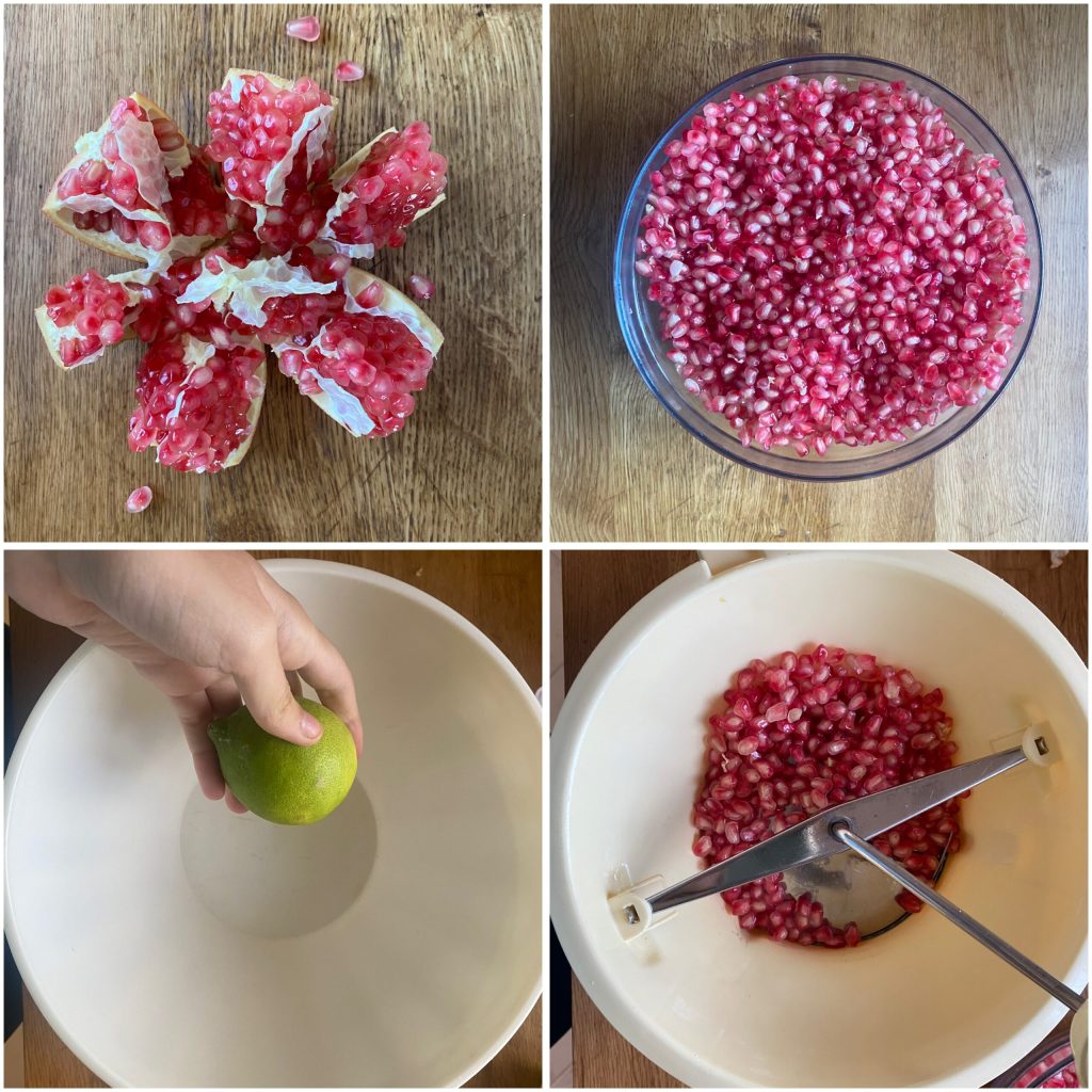 en open vervolgens de granaatappel in partjes. Nu kun je de granaatappel gemakkelijk ontpitten. Pers daarna een citroen en vang het sap op in een kom, en laat de pitjes door de zeefmolen lopen om het sap eruit te halen.