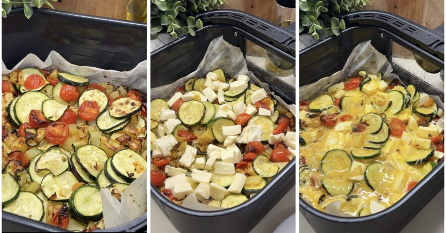 Ik bakte de groenteomelet in de heteluchtfriteuse en deed hetzelfde met de groenten die erin zitten, maar je kunt er ook voor kiezen alles in een pan of in de oven te bereiden voor dezelfde tijden.