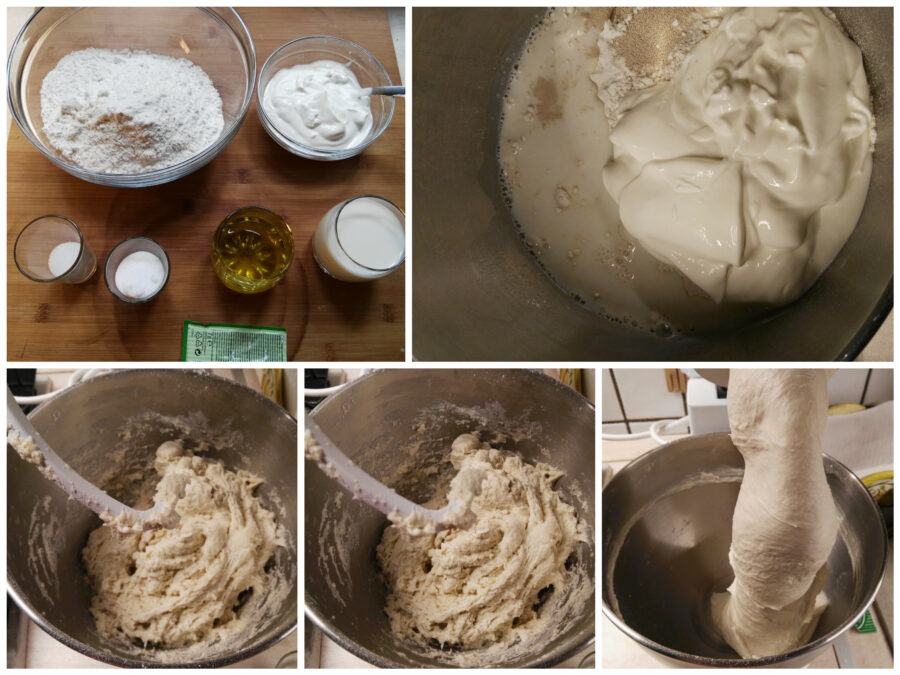 • Bereid alle ingrediënten voor en verwarm de melk en de yoghurt een beetje; het is voldoende dat ze niet koud uit de koelkast zijn. Doe alle ingrediënten in de kom van de keukenmachine, behalve de olie die we later toevoegen, zet deze aan en laat het deeg goed inwikkelen; dit duurt ongeveer 20 minuten.