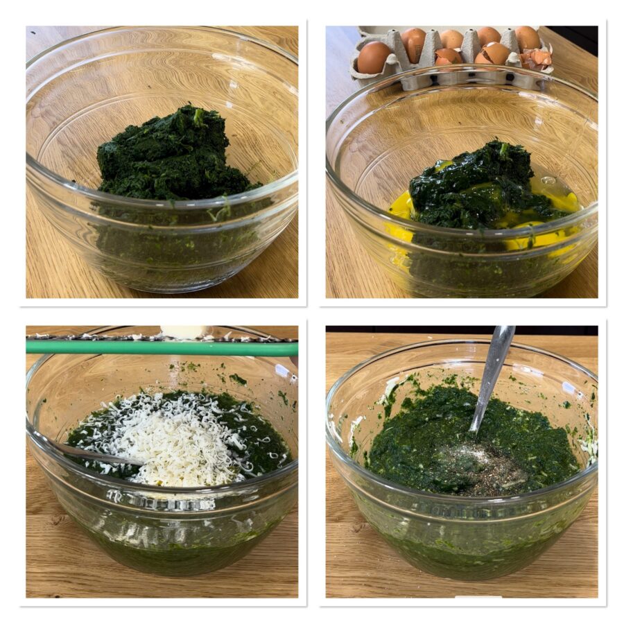 Doe de gepureerde spinazie in een kom, voeg de eieren, een snufje zout, peper en de geraspte kaas toe. Meng alles goed door elkaar.
