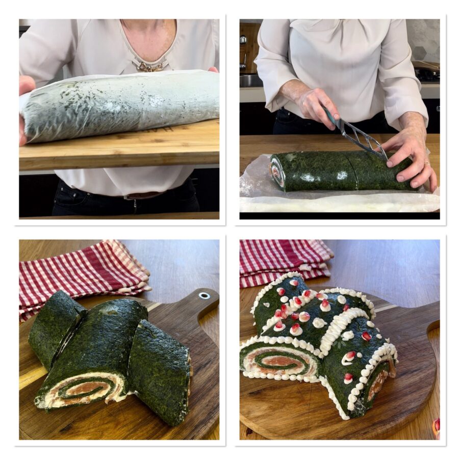 Hartige kerststronk op basis van omelet, glutenvrij met gerookte zalm, gemaakt zonder sandwichbrood. De hartige kerststronk is een smaakvol en decoratief voorgerecht, de hartige variant van de zoete kerststronk, je kunt hem op duizend manieren bereiden en hij brengt smaak en vrolijkheid naar de feesttafel! De kerststronk is een gevulde hartige rol die je zonder bakken kunt maken zoals de hartige stronk met tonijn en zalm, of je kunt hem ook bakken voor een heerlijke glutenvrije versie, zoals degene die we vandaag gaan bereiden. De basis van onze stronk is namelijk een lekkere ovengebakken spinazie-omelet, groen als een van de kleuren van Kerstmis, gevuld met robiola op smaak gebracht met citroen en zalm en opgerold als een traditionele hartige stronk. Als je dus op zoek bent naar glutenvrije recepten voor Kerst en Nieuwjaar, kan dit heel eenvoudig, decoratief en smaakvol glutenvrij voorgerecht je zeker helpen! Laten we nu naar de keuken gaan en samen ontdekken hoe je deze hartige kerststronk met zalm en omeletrol maakt — je zult er verliefd op worden. Maar voordat je naar het fornuis rent, herinner ik je eraan dat je mijn pagina kunt volgen op Facebook en mijn profiel op Instagram om op de hoogte te blijven van nieuwe recepten.