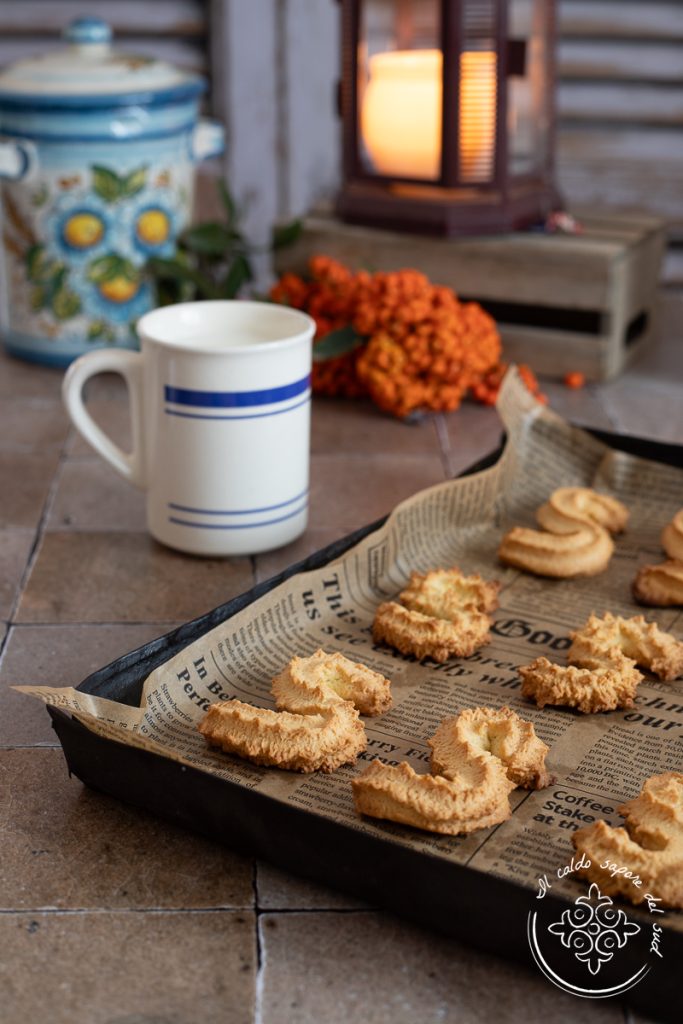 Pers het deeg door de juiste machine, gebruik een stervormige spuitmond of het geschikte accessoire, altijd met stervorm. Pers stukken deeg van ongeveer 15 cm en vorm de beroemde “S”-vormen.
