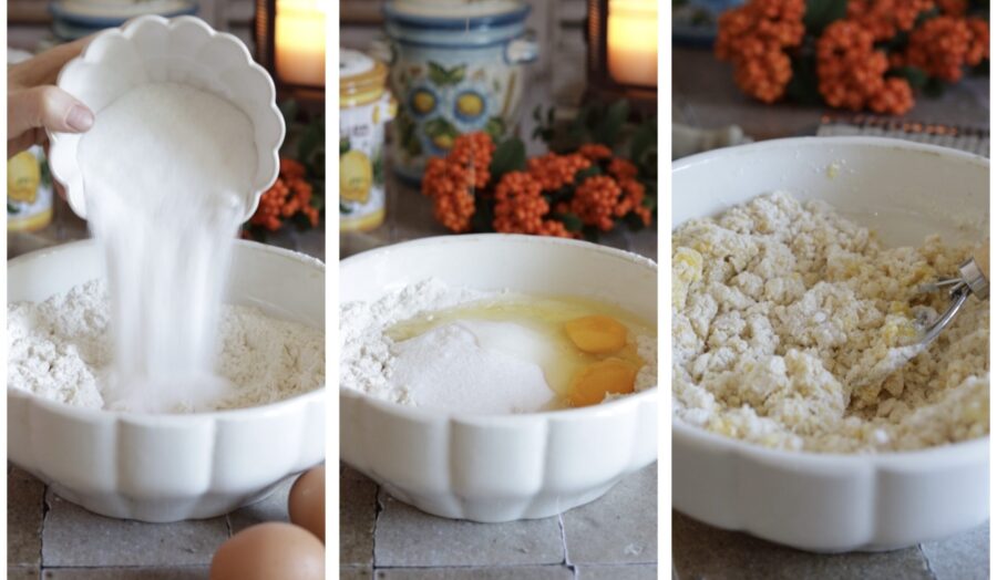 Om de “Squisiti” koekjes uit Modica te maken, doe de bloem in een kom, voeg de reuzel toe en meng alles door elkaar.