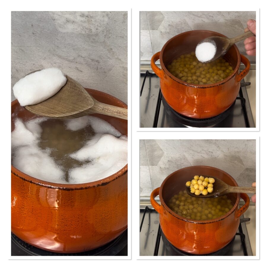 -Vroeger werden kikkererwten gekookt met regenwater dat in cisternen werd opgevangen; tegenwoordig zijn de tijden veranderd en vaak hebben we thuis systemen die water demineraliseren. Dergelijk water kun je gebruiken, maar vermeng het dan met wat kraanwater in een verhouding van 1/4 van het totaal.