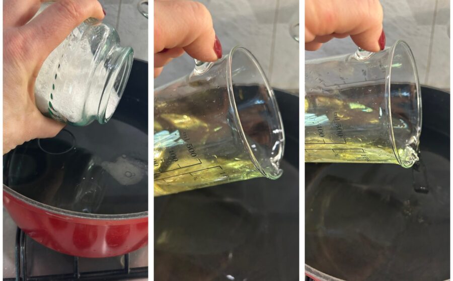 Verwarm het water licht, voeg zout, olie en azijn toe en roer goed door zodat alles goed gemengd is.