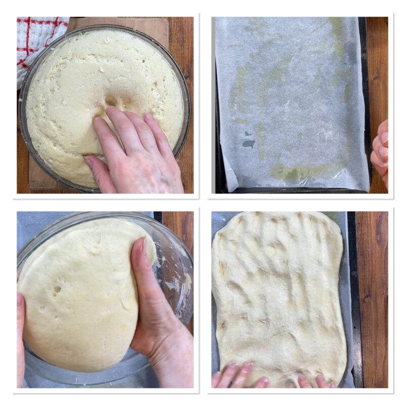 Na die tijd bestrijk je het oppervlak met olie en maak je met je vingertoppen de klassieke kuiltjes. Giet de passata in het midden van de focaccia, voeg zout, olie, suiker en oregano toe en roer door, verdeel vervolgens gelijkmatig over het gehele oppervlak van de focaccia. Bak in een voorverwarmde oven op 200°C gedurende 30-35 minuten of tot de gewenste goudbruine kleur (de saus moet opdrogen; indien nodig kun je nog een paar minuten onder de grill zetten!).
