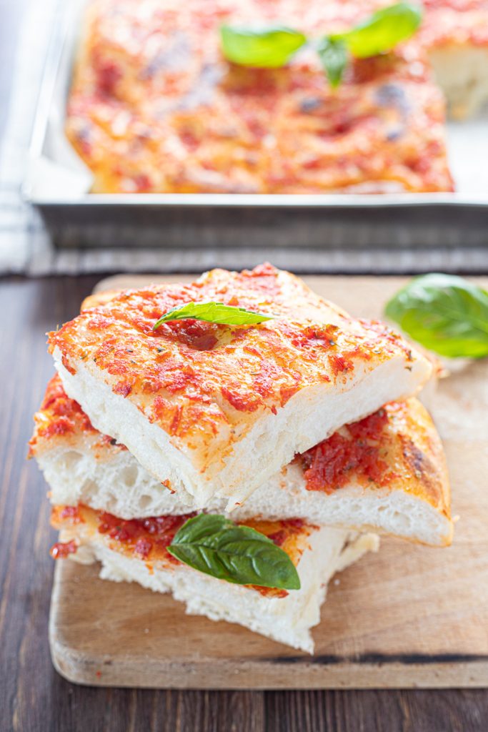 Hoge en zachte rode focaccia met tomaat. Voor sommigen is het focaccia met tomaat, voor anderen is het de rode plaatpizza, maar één ding is zeker: het is heerlijk en maakt onmiskenbaar deel uit van onze verzameling gewijd aan focaccia en zijn vele verrukkelijke varianten! Door de jaren heen hebben we talloze focacce gemaakt, van de lage en krokante focaccia met lange rijs tot de hoge focaccia om te vullen zoals van de bakker, om nog maar te zwijgen van de zachte focaccia met zuurdesem, de focaccia met deeg op basis van aardappel en ui, de beroemde Focaccia Barese met cherrytomaatjes en olijven en de zoute Florentijnse schiacciata, maar de versie van de krokante rode focaccia met tomaat ontbrak nog! Deze heerlijke focaccia, die ook kan veranderen in een smakelijke plaatpizza, is echt heel eenvoudig te bereiden. Hij wordt belegd met eenvoudige huisgemaakte tomatensaus, maar het resultaat is gegarandeerd en je zult je vingers aflikken van de saus! Licht, zacht en geurend, maar met een krokante bodem, het wordt een echte hit, perfect voor zowel het avondeten als de snack voor groot en klein! Smaakvol en met de onmisbare sprinkeling oregano, zal de focaccia met tomaat je op het eerste hapje laten smelten en kan ook de perfecte basis zijn voor een smakelijk aperitief! Willen jullie ‘m ook proberen? Laten we naar de keuken gaan, maar voordat we beginnen herinner ik je eraan dat je mijn Facebookpagina (hier) en mijn Instagramprofiel (hier) kunt volgen om op de hoogte te blijven van al mijn recepten!