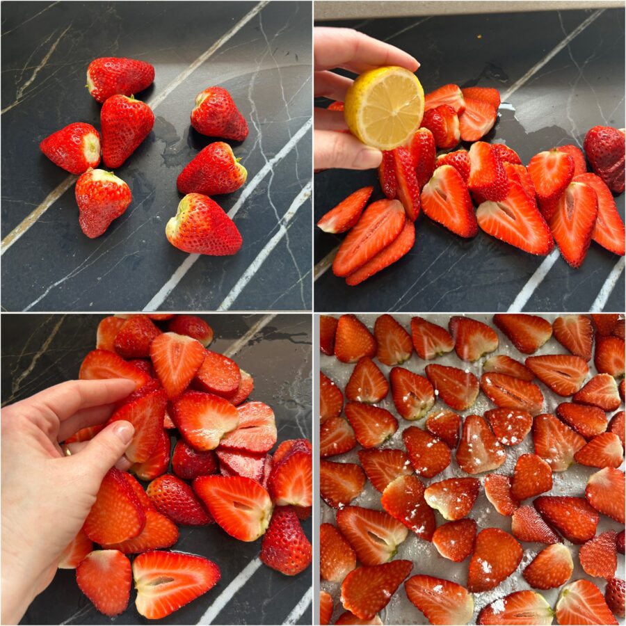 • Leg de aardbeien op een met bakpapier beklede bakplaat, goed uitgespreid en zonder overlap.