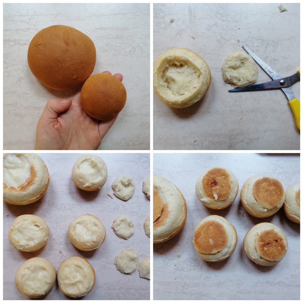 Knip met een scherpe schaar de onderkant van het broodje af, alsof je een dop maakt, en leg deze apart.