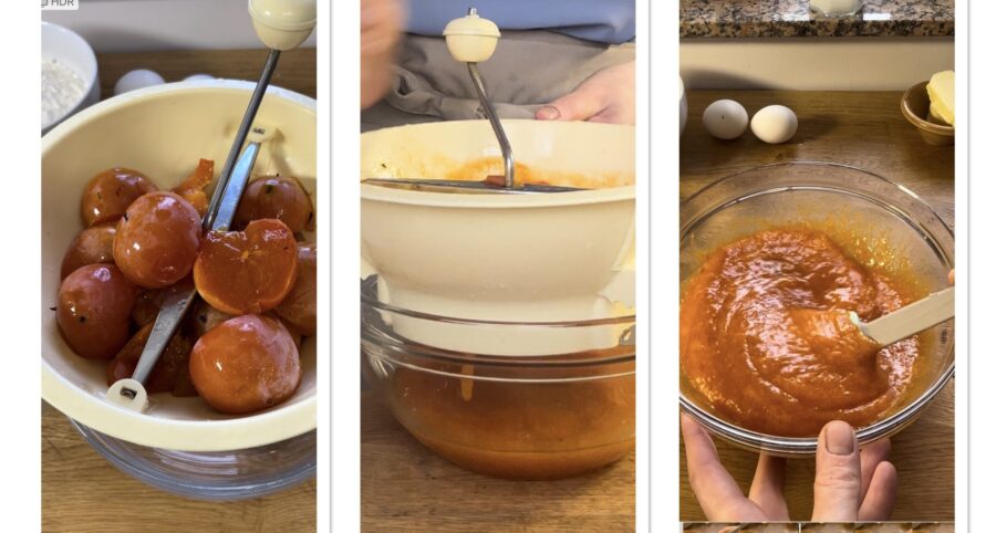 Om de kaki- en cacaotaart te maken, spoelt u de kaki’s, verwijdert u het steeltje en pureert u de rijpe vrucht; passeer vervolgens het vruchtvlees door een zeef en vang het in een kom op.