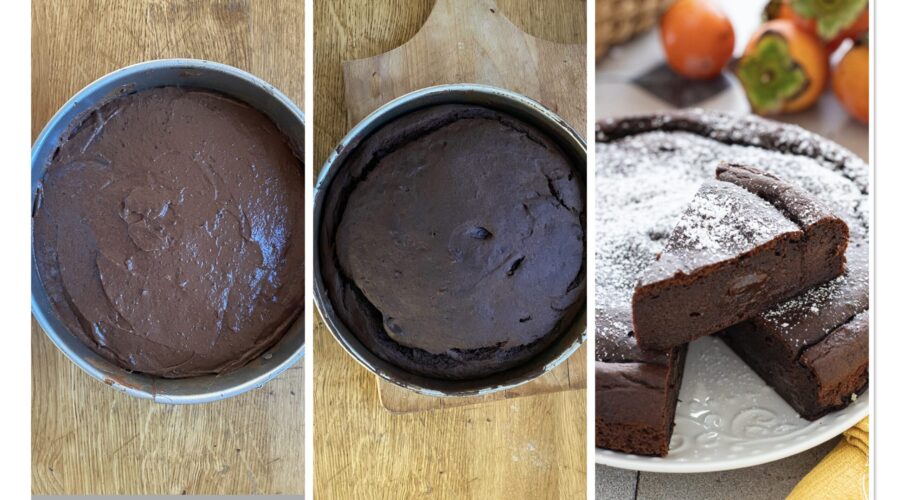 Kaki- en chocoladetaart zonder suiker, het herfstige recept voor een taart zonder of met heel weinig suiker, maar waanzinnig lekker, net als de kaki- en cacaopudding! Als je houdt van chocoladedesserts en herfstige zoetigheden, is deze heerlijke lichte kaki- en chocoladetaart een dessert met kaki en pure chocolade dat je zonder suiker kunt maken wanneer de kaki’s heel zoet en rijp zijn. Romig en vol van smaak, perfect wanneer de kaki’s in seizoen zijn; hij kan in de oven of in de airfryer worden gebakken en verovert bij de eerste hap. Een taart met een zachte, omhullende en delicate structuur die vochtig blijft, ideaal ook als nagerecht aan het einde van de maaltijd, maar eveneens heerlijk als ontbijt of als tussendoortje in de namiddag. Een recept dat wordt gemaakt door de rijpe kaki’s te pureren, die het hoofdingrediënt vormen, waaraan slechts een paar andere ingrediënten worden toegevoegd om de romige textuur te verkrijgen die we willen. De kaki- en chocoladetaart is een origineel, makkelijk en snel te maken gerecht dat de onmiskenbare geur van pure chocolade combineert met de zoetheid en zachtheid van de meest verrukkelijke herfstvrucht — een dessert dat je absoluut moet proberen en waarvan je bij de eerste zoete hap zult houden! Laten we nu naar de keuken gaan en de taart met pure chocolade en kaki’s samen bereiden; wat een spektakel, ik maakte hem met de overvloed van de vruchten van mijn boompje en ik denk dat ik hem nog vaak zal maken, of totdat de kaki’s van mijn boompje zo talrijk zijn dat ze op moeten!! Voordat we naar de keuken gaan, herinner ik je er zoals altijd aan dat je, als je op de hoogte wilt blijven van mijn recepten, mijn pagina kunt volgen op Facebook en mijn profiel op Instagram.