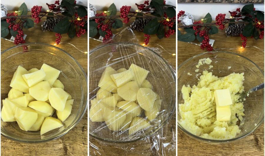 • Terwijl de tartelletjes bakken en afkoelen, schil je de aardappelen, spoel ze af, doe ze in een kom, voeg 100 ml water toe, dek af met magnetronfolie en kook op 900W gedurende 25 minuten. Laat 10 minuten staan in de magnetron, verwijder dan de folie en stamp de aardappelen goed fijn.