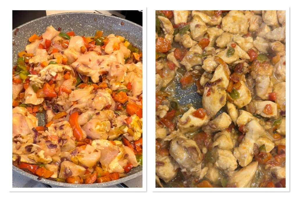 Als de paprika’s zacht zijn, voeg je de kip toe, zet het vuur hoger en laat even meebakken zodat alles smaak krijgt. Voeg de azijn toe, doe de suiker erbij en roer om; breng op smaak met zout. Zodra de azijn is verdampt, voeg je een halve kop water toe en laat je het nog ongeveer 20 minuten koken op een matig vuur, regelmatig roerend.