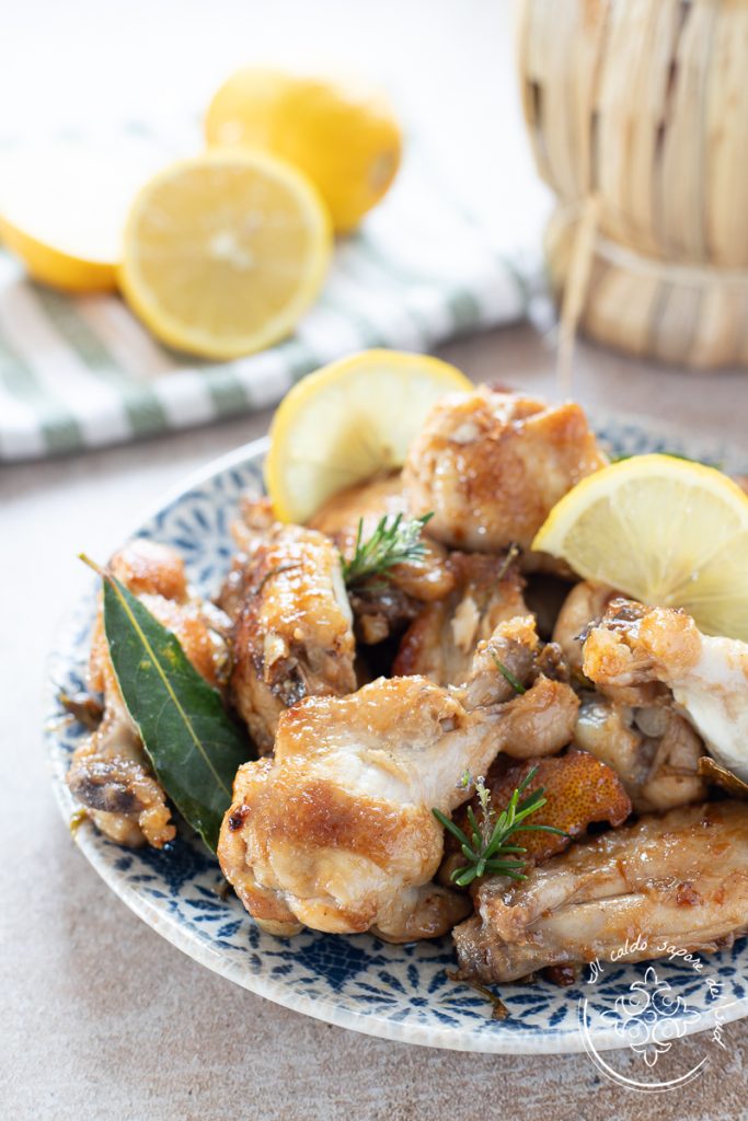 En zodra de alcohol verdampt is, breng je op smaak met zout en voeg je de citroen toe. Laat 20-25 minuten zachtjes koken met de deksel op de pan, zet daarna het vuur hoger en wacht tot de kip in zijn eigen sappen bruin wordt. Als je wilt, kun je op dit punt een theelepel suiker of honing toevoegen om een zoetzure toets toe te voegen die de zuurte van de citroen verzacht, en even doorroeren. Mijn kinderen houden van deze laatste versie, dus ik voeg het er vaak aan toe. De kippenvleugels met citroen uit de pan zijn nu klaar om op tafel te brengen en van te genieten.