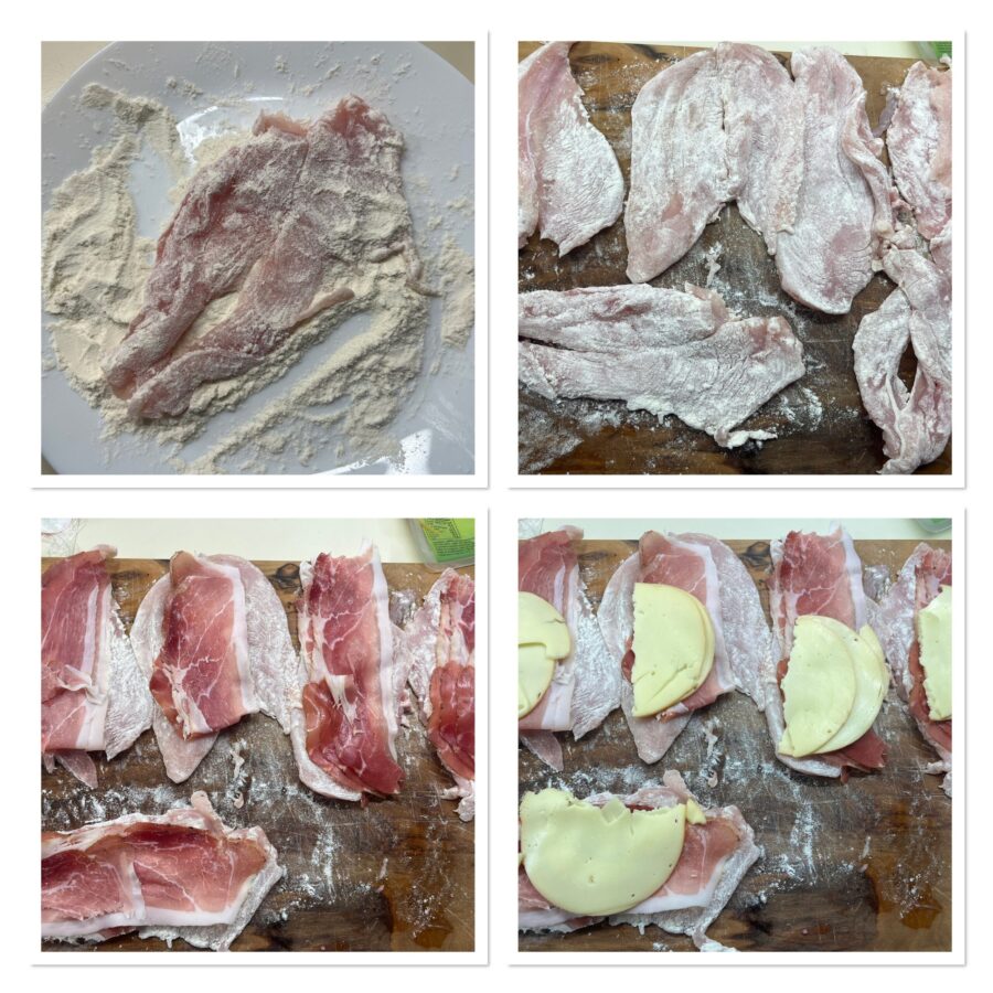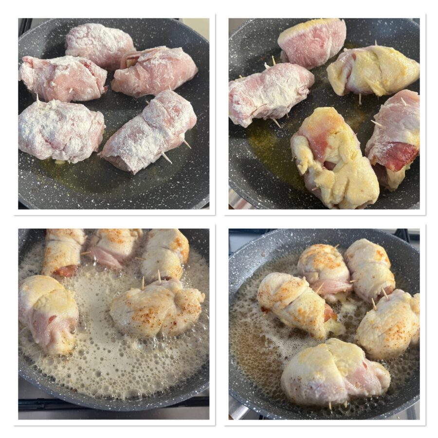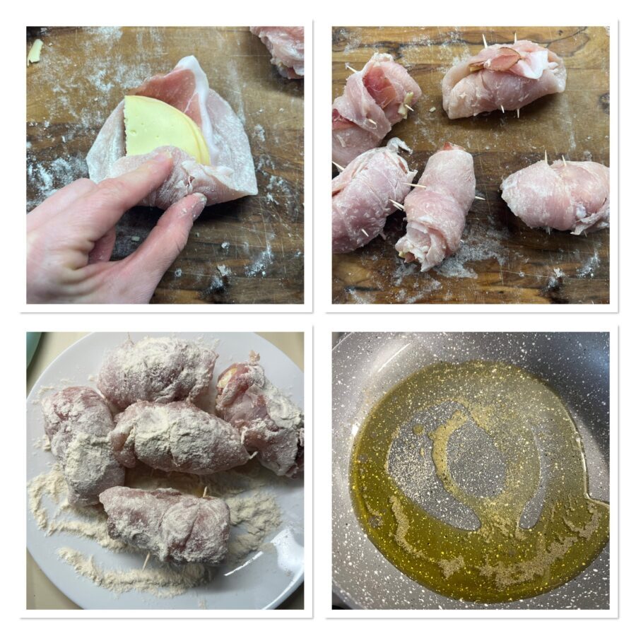 Ik heb de rolletjes met bier gemaakt met kipfilet, maar je kunt ook kalfsschnitzels, kalkoen of varkenshaas gebruiken. Haal de plakjes door de bloem zodat het goed blijft plakken, beleg elk plakje met twee plakjes speck en de provola in plakjes (in de supermarkt vind je ze op de juiste dikte), rol op tot een rolletje, zet alles vast met prikkers en ga op dezelfde manier te werk voor alle plakjes.