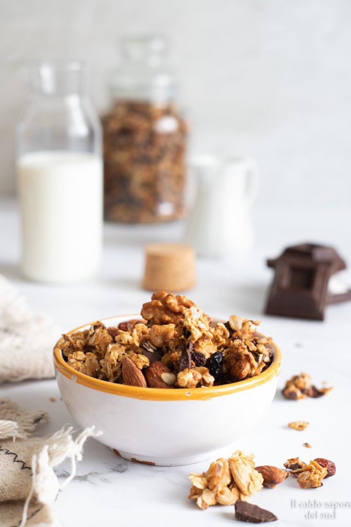 De lichte granola zonder suiker met pure chocolade is een eenvoudige en natuurlijke oplossing voor een gezond zelfgemaakt ontbijt, perfect voor wie iets knapperigs en lekkers wil zonder geraffineerde suikers. Het is in enkele minuten te bereiden met makkelijk verkrijgbare ingrediënten en is ideaal om te eten met yoghurt, melk of plantaardige dranken.