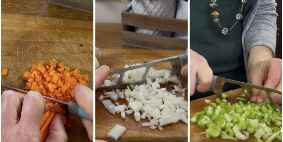 Schil en spoel de wortelen, ui en selderij en snijd alles fijn. Doe de fijngesneden groenten in een pan en giet er een scheutje olie bij. Laat op een laag vuur zachtjes zachtjes stoven totdat ze zacht zijn.