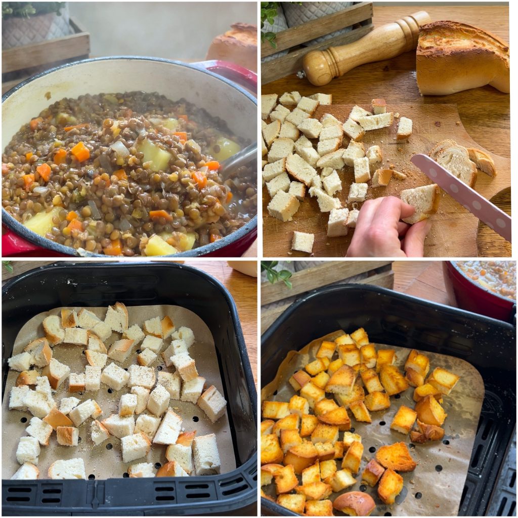 ga door met koken gedurende nog eens twintig minuten. Zet de kookplaat uit en houd het deksel op de pan; ga ondertussen verder met het klaarmaken van de croutons.