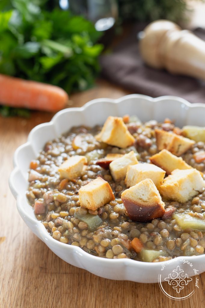 Linzen- en pancetta-soep met aardappelen, het oma-recept voor een voedzame, rijke en smaakvolle eenpansgerecht. De linzen-, pancetta- en aardappelsoep, met veel gekruide croutons, gemaakt met het Pane a pasta dura, is een gerecht dat thuis altijd gewaardeerd wordt: zo romig en omhullend als de bonensoep met aardappelen of die met kikkererwten, is deze linzen- en pancetta-soep makkelijk te maken en heerlijk om te eten. De mediterrane keuken, dat weten jullie vast al, is zeer rijk aan gerechten waarin peulvruchten, granen of groenten de hoofdrol spelen — smakelijke en gezonde gerechten zoals de pasta- en kikkererwtensoep, maar ook de pizza in zijn eenvoudigste vorm, de Pizza Margherita, om nog maar te zwijgen van de vele recepten voor zelfgebakken brood. Vandaag, om onze reis door recepten met peulvruchten uit te breiden, bereiden we de linzen-, pancetta- en aardappelsoep, een snel en eenvoudig recept van mijn grootmoeder, gemaakt met een goede groentebouillon en zonder weken, perfect om aan tafel te brengen als een gezonde, vezelrijke en voedzame eenpansmaaltijd. En als je wilt, kun je met dezelfde linzen ook een gerecht maken zoals pasta met linzen, waardig voor een koning. Klaar om naar de keuken te gaan? Laten we ontdekken hoe je de oma’s linzen- en pancetta-soep maakt, maar voordat we beginnen herinner ik je eraan dat je, als je op de hoogte wilt blijven van al mijn recepten, mijn Facebook-pagina kunt volgen (hier) en mijn Instagram-profiel (hier)