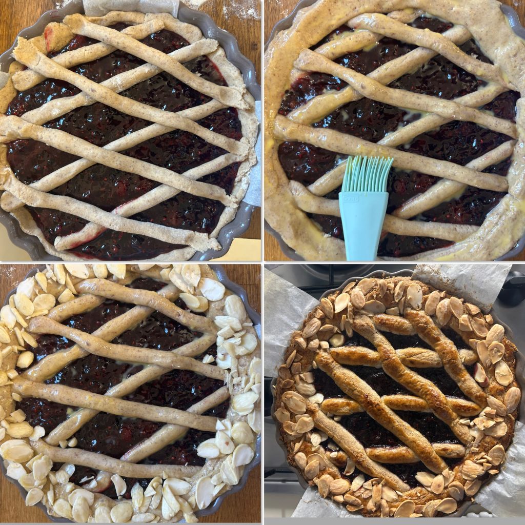 Voeg de jam van bosbessen, aalbessen of frambozen toe en trek met het overgebleven deeg stroken om de rand te bekleden en de klassieke rasterversiering te maken. Bestrijk met losgeklopt ei en bestrooi de randen met amandelvlokken.