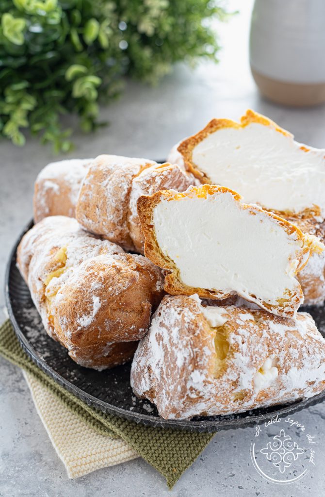 Lulù Messinese, gebakjes gevuld met opgeklopte room op basis van chouxdeeg, hetzelfde deeg dat gebruikt wordt voor bignè, zeppole, sfince di San Giuseppe, churros, Paris Brest en nog veel meer… De lulù messinesi zijn eenvoudige Siciliaanse gebakjes die deel uitmaken van de Siciliaanse keuken en oma’s recepten waar we zo van houden. Het recept voor de lulù messinese is eenvoudig en roept herinneringen op aan die banketbakkersgebakjes die we als kinderen zo graag aten, zoals de zwaan van bignè-deeg en room. Ik heb ze gevuld met een eenvoudige chantillyroom, maar als je ze nog lekkerder wilt maken, raad ik aan de crema lulù te maken, wat niets anders is dan een diplomaatcrème, dus de banketbakkersroom met room. Kom, laten we de keuken in gaan en samen het recept van de lulù messinese ontdekken, maar voordat we beginnen wil ik je eraan herinneren dat als je op de hoogte wilt blijven van al mijn recepten je mijn Facebookpagina kunt volgen (hier) en mijn Instagramprofiel (hier).