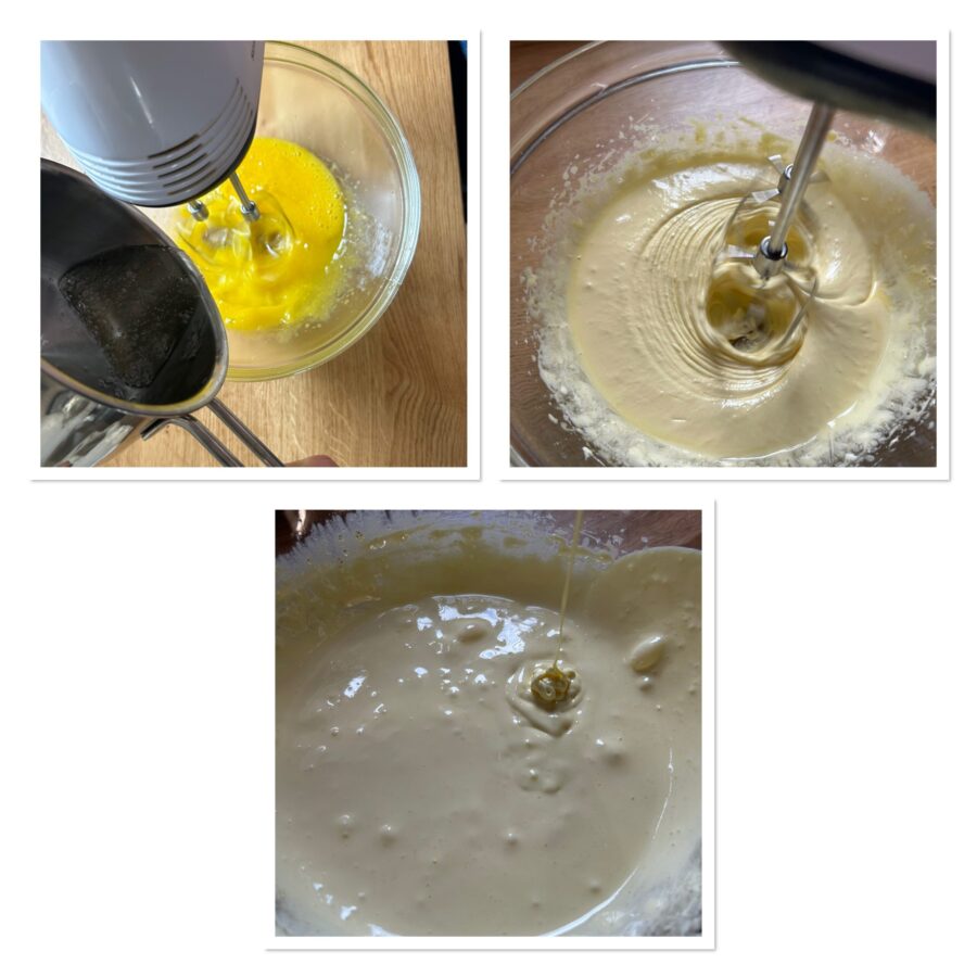 Zodra het siroop 121°C heeft bereikt, giet je het langzaam op de eidooiers terwijl je op hoge snelheid blijft kloppen totdat je een luchtig, licht en schuimig mengsel krijgt. Blijf kloppen totdat het mengsel kamertemperatuur heeft bereikt; de pâte à bombe is dan klaar voor gebruik.