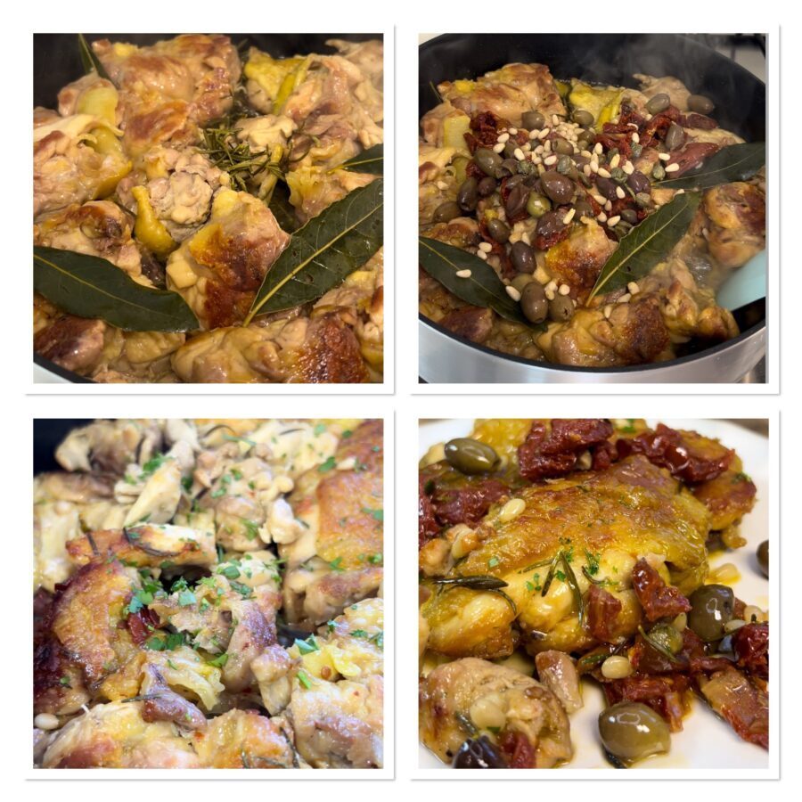 Mediterrane kip in de pan, met zongedroogde tomaten, olijven, kappertjes, rozijnen en pijnboompitten, zeer mals, sappig en met een heerlijk goudbruin korstje, perfect als je niet weet hoe je kip moet bereiden, en een heerlijk recept zoals Pollo alla cacciatora of Pollo alla birra in casseruola. Als je een hoofdgerecht van vlees wilt dat makkelijk te bereiden, betaalbaar, mals en heel smaakvol is, dan is de kip in de pan op Mediterrane wijze een van de recepten die je absoluut moet proberen. Een paar ingrediënten, vaak al in je voorraadkast en anders gemakkelijk te vinden, geven je een heerlijk geurige, kleurrijke en vooral smaakvolle kip en als je wilt kun je ook de Kipfilet op Mediterrane wijze met uien en zongedroogde tomaten klaarmaken.