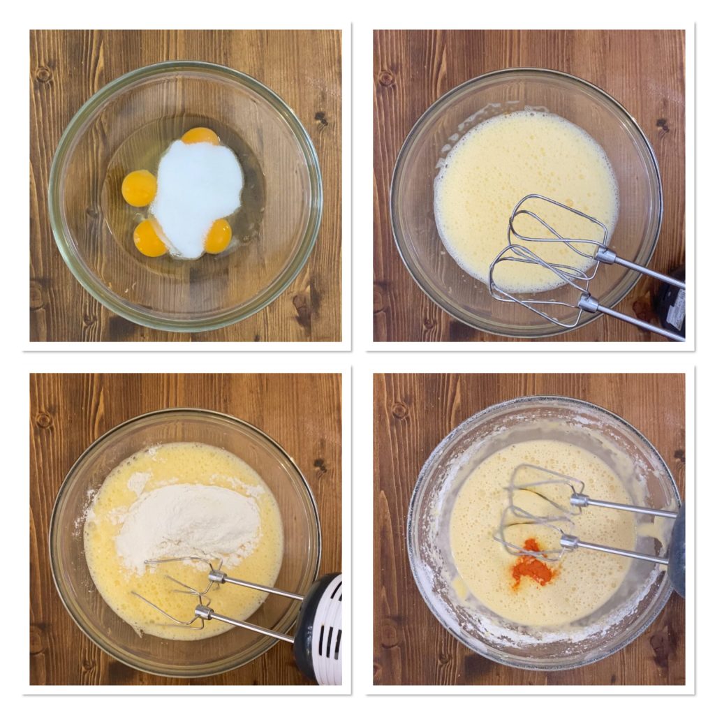 Klop in een ruime kom de eieren met de suiker, voeg beetje bij beetje de bloem toe, de kleurstof en het bakpoeder.
