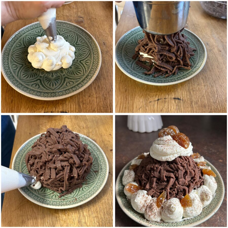 Meng de suiker en het vanille-extract door de koude slagroom en klop deze op met koude garde en in een koude kom (kou helpt bij het goed stijf kloppen). Plaats ongeveer de helft van de opgeklopte room in het midden van een dessertbord. Vul de aardappelstamper (of passe-vite) met de kastanjepuree en druk deze er bovenop uit, zodat er een bergje ontstaat dat de room bedekt. Garneer met toefjes room, een lichte bestuiving van cacao en marron glacé.