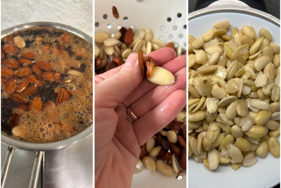 Breng water aan de kook, zet het vuur uit en dompel de amandelen erin; laat ze drie minuten rusten.