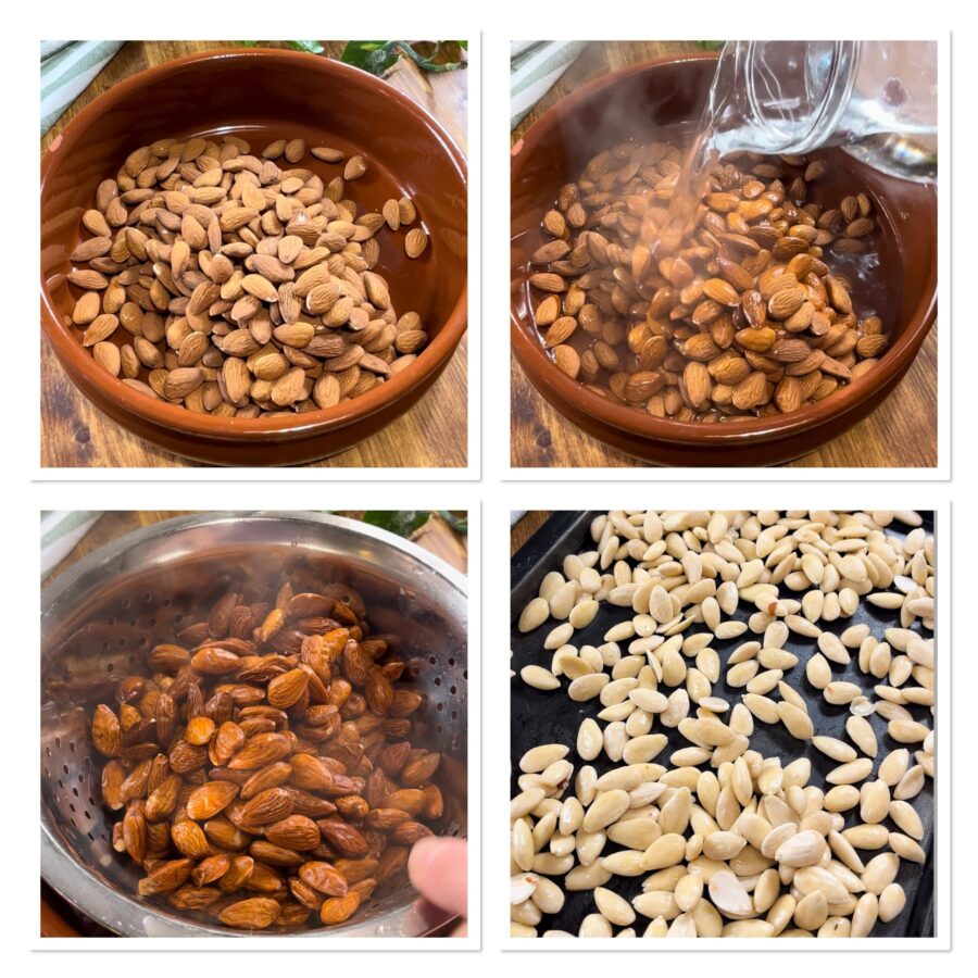 • Gebruik amandelen met schil en blancheer ze zelf voor het beste resultaat. Doe de amandelen in een kom en schenk er kokend water over. Laat 10 minuten staan en giet af: het velletje zal zachter zijn en je kunt ze makkelijk pellen. Leg ze op een bakplaat en droog ze 10–15 minuten in de oven op 160°C; ze hoeven alleen een beetje uit te drogen. Als alternatief kun je ze 24 uur in de open lucht laten drogen.