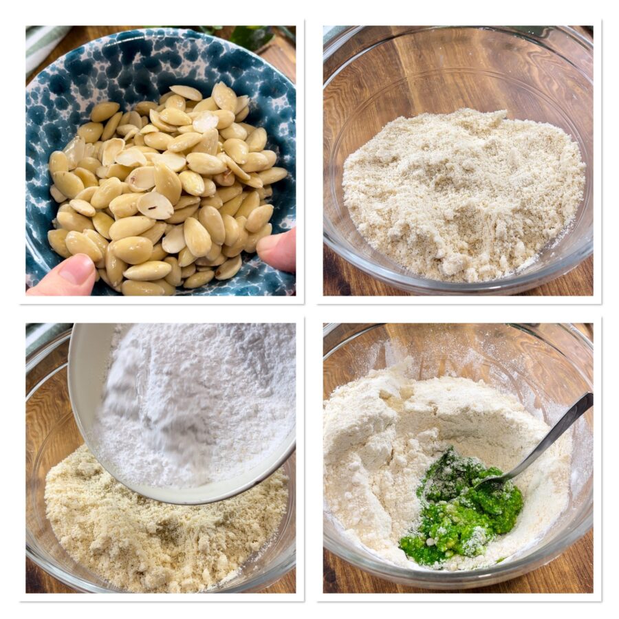 • Maald de amandelen (ze moeten op kamertemperatuur zijn) zo fijn mogelijk, maar voorkom oververhitting zodat het olie uit de amandelen niet vrijkomt. Meng het verkregen amandelmeel met de poedersuiker, voeg de likeur, het vanille-extract en de kleurstof toe.