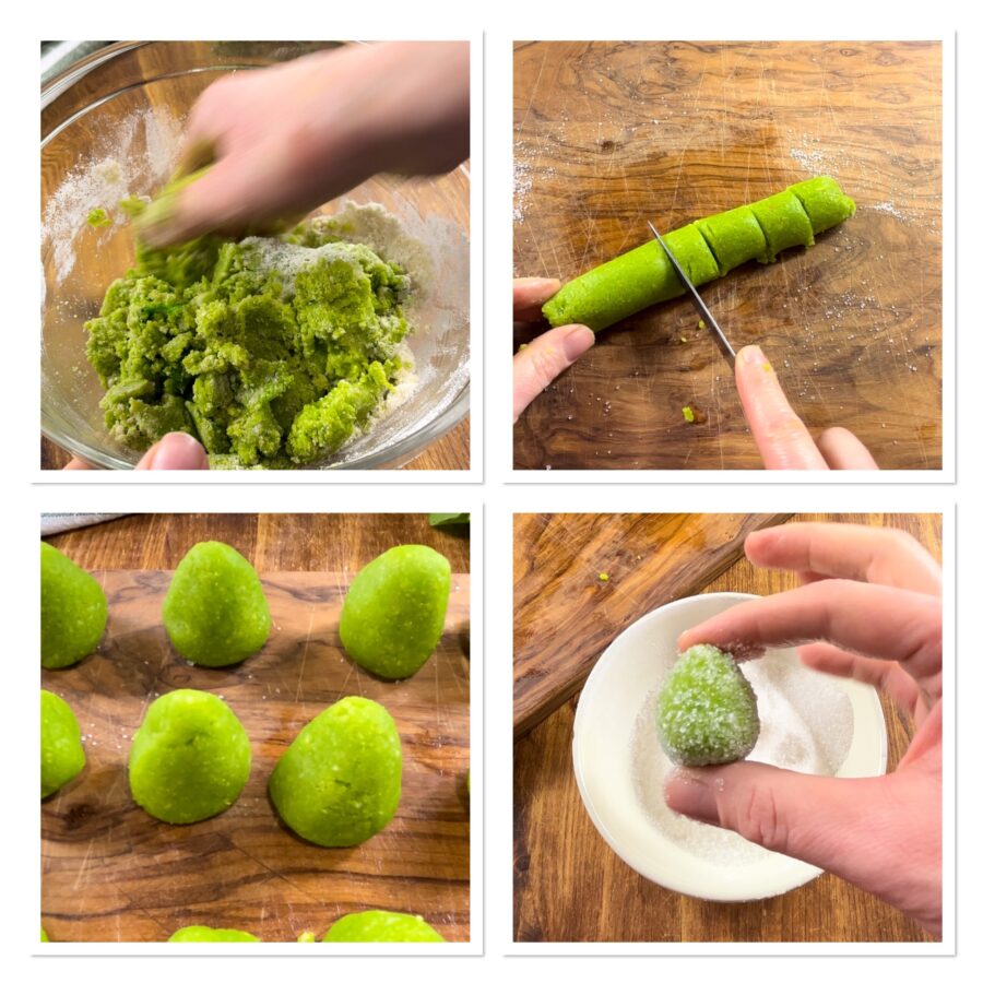 • Als je een kneedbaar mengsel hebt, rol je er worstjes van ongeveer 2 cm doorsnede en snijd die in stukjes van 1,5 cm. Vorm de olijfjes door ze puntig te modelleren en rol ze door de kristalsuiker.