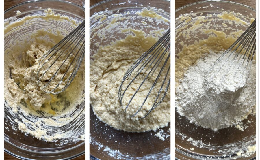 Voeg ook de eiwitten toe en klop met de garde om ze te mengen. Voeg de bloem toe