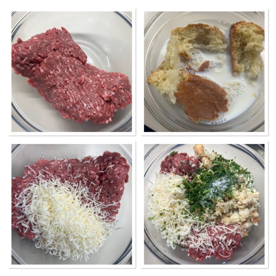 Doe het gehakt in een kom en voeg het oud brood dat minstens 20 minuten eerder is geweekt, uitgeknepen en verkruimeld, toe. Voeg de geraspte kaas, de eieren, fijngehakte peterselie en een snufje zout toe,