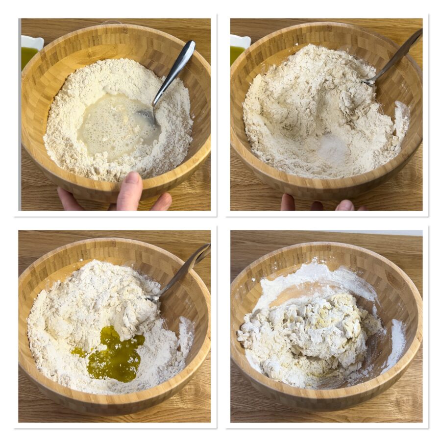 Meng, voeg bijna al het water toe, kneed zodat het mengt en voeg dan het zout, de olie en de rest van de vloeistof toe. Kneed in de kom en zodra alle ingrediënten zijn opgenomen, keer je het deeg op het werkvlak en kneed je het krachtig verder.