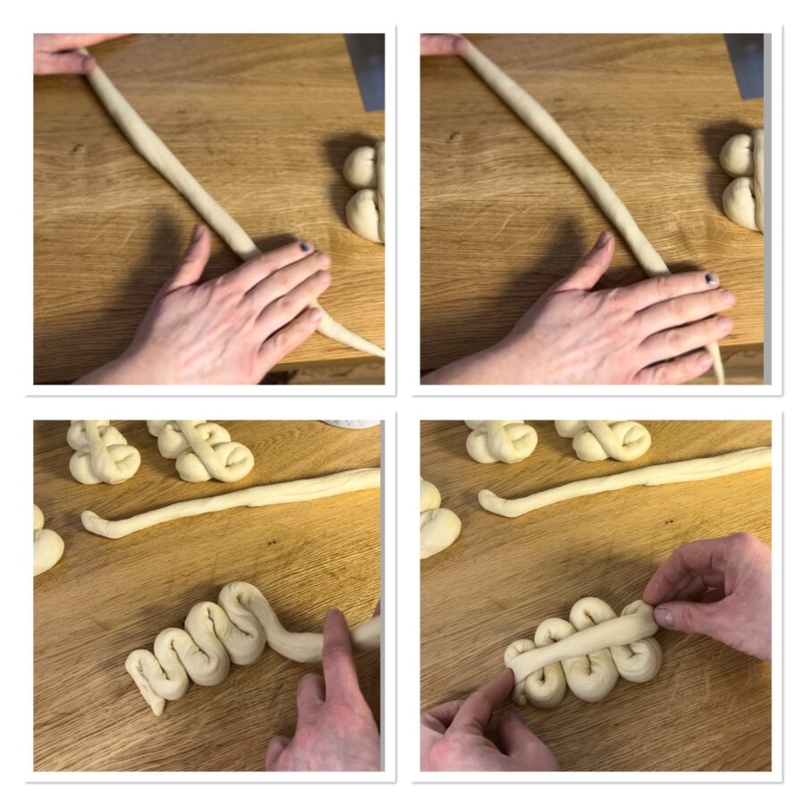 Leg elke mafaldina op een met bakpapier beklede bakplaat, dek af met een doek en laat nogmaals rijzen op een warme plaats, ongeveer 40 minuten of in elk geval tot het volume wederom verdubbeld is.