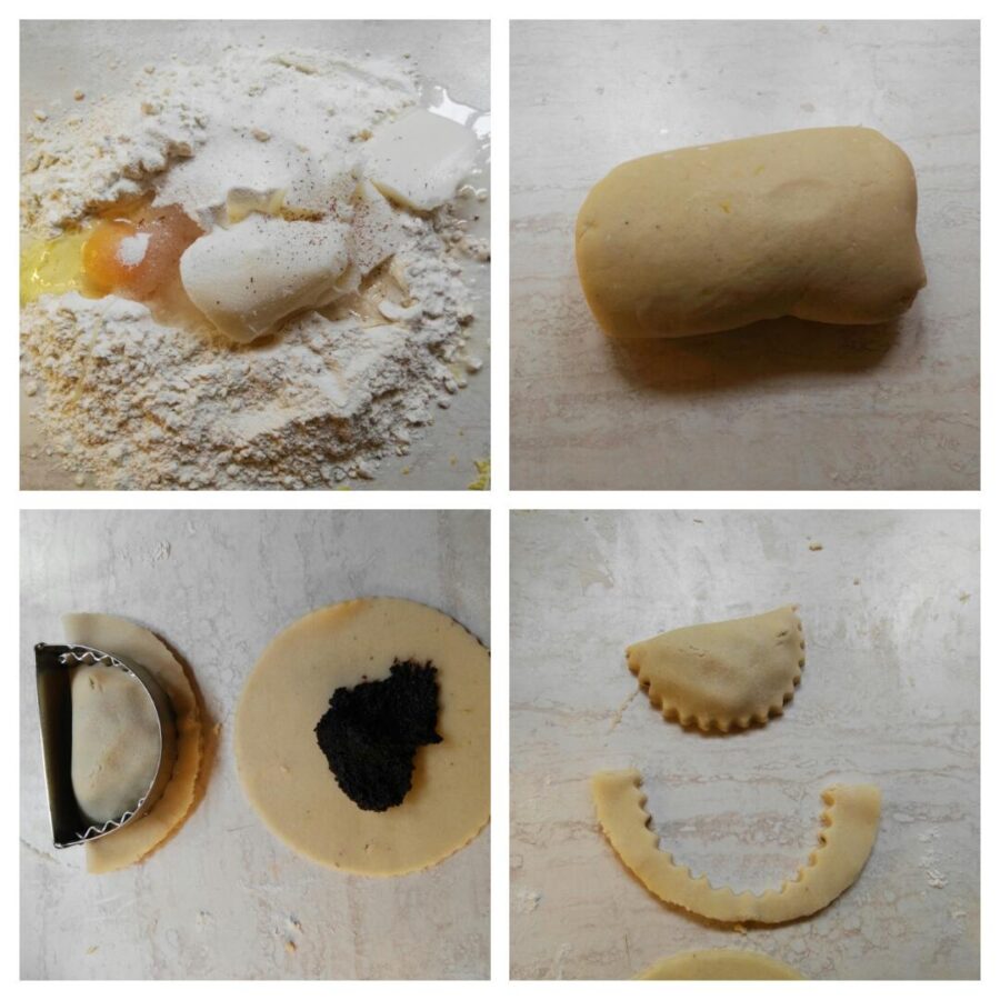 • De volgende ochtend maak je het zanddeeg. Doe de bloem op een werkvlak, maak een kuiltje en voeg de ingrediënten toe; kneed tot een glad en homogeen deeg dat je een uur in de koelkast legt. Na die tijd rol je het deeg uit tot een dikte van ongeveer 0,2-0,3 mm, steek je rondjes uit en leg je op elk rondje een geringe eetlepel vulling. Bestrijk de randen met water en vouw dicht tot een halve maan. De cassatelle zouden met het getande vormpje moeten worden afgesneden dat je op de foto ziet. Nadat ik het overal online en in huishoudwinkels vergeefs had gezocht, moest ik naar Agira om het te kopen en ontdekte ik dat het bij ijzerwarenwinkels te vinden is, omdat het een met de hand bewerkt stalen voorwerp is. Als je er een nodig hebt, neem dan contact op met een lokale ijzerwarenwinkel en vraag of ze het kunnen verzenden.