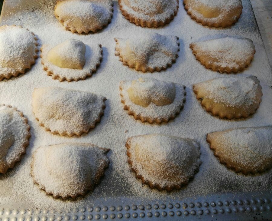 Typische zoetigheden uit de paastraditie van Agira in de provincie Enna, tegenwoordig aanwezig in een groot deel van Oost-Sicilië. Het zijn gebakjes met een onvergetelijke consistentie; hun smeltende textuur in de mond maakt ze zeer waardevol. De traditionele cassatelle di Agira moeten de vorm van een halve cirkel hebben met de gekartelde gebogen rand, ze moeten ongeveer 10×6 cm groot zijn en moeten noodzakelijkerwijze vervaardigd worden met een specifiek vormpje dat u alleen in Agira kunt kopen, omdat het gemaakt wordt door plaatselijke smeedmeesters en niet door de grote industrie. Gemaakt op basis van een zachte zanddeegbodem, de zogeheten “pasta tenerina”, van een heel bleekgouden kleur, worden ze bestrooid met poedersuiker; de vulling bestaat uit cacao, geroosterde amandelen, kikkererwtenmeel, suiker, bij voorkeur gedroogde citroenschil, kaneel en soms kruidnagel. De evenwichtige smaak van cacao mag die van de amandelen niet overheersen; het deeg moet niet taai noch te zacht zijn en in de mond wegsmelten. Kortom: de cassatelle di Agira volgens de traditie van Agira zijn kleine juweeltjes uit de Siciliaanse banketbakkerij die je niet mag missen, een van de recepten die je ook zult vinden in mijn mijn boek. Benieuwd en wil je ze zelf maken? Kom op, laten we meteen aan de slag!