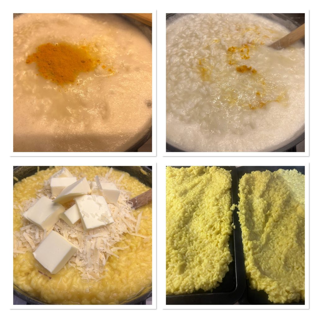 Als er teveel bouillon in de pan is, schep het overtollige met een pollepel eruit en gooi het weg, zet het vuur uit, voeg de saffraan, de boter en de Parmezaan toe, meng en verdeel alles over twee lage, ruime bakplaten of ovenschaal.
