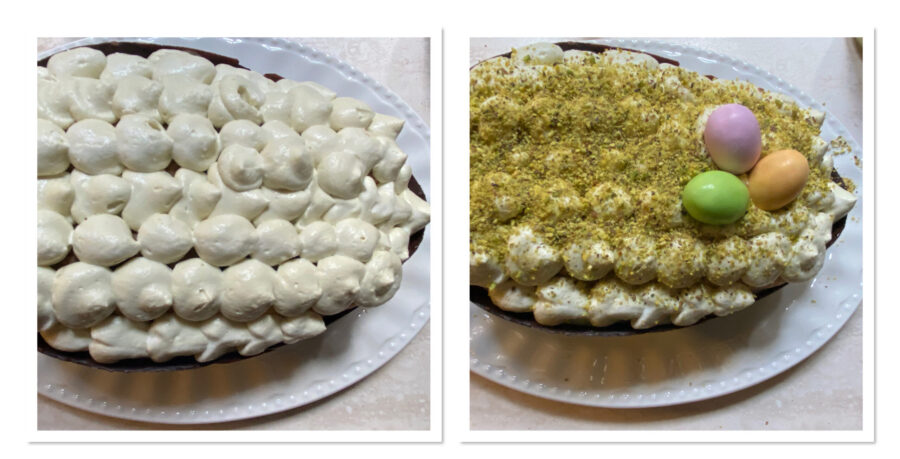 Als het ei gevuld is, maak je de bovenste laag af door de mousse met een spuitzak te extruderen. Garneer met extra pistachepoeder en de kleine chocolade-eitjes.