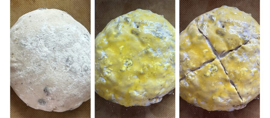 Keer het deeg op een met bakpapier beklede bakplaat, bestrijk met losgeklopt ei, maak op beide broden een inkeping in de vorm van een kruis en bak in een voorverwarmde oven op 160°C gedurende 45 minuten.