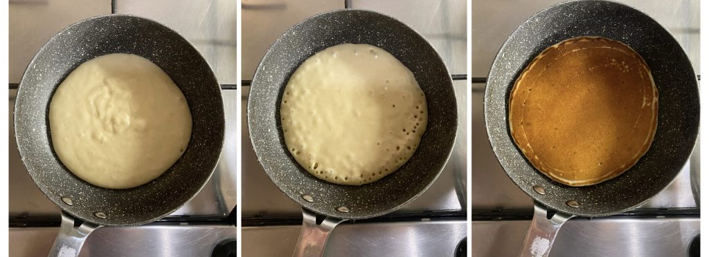 Voeg beetje bij beetje het mengsel van boter, melk en banaan toe aan de kom met de droge ingrediënten, zorg dat er geen klontjes ontstaan (om het beslag nog homogener te maken kunt u ook het vloeibare gedeelte door een zeef halen). Zet de licht ingevette koekenpan met olie of boter op het vuur en zodra deze warm, maar niet gloeiend heet is, giet u de eerste pollepel van het beslag.