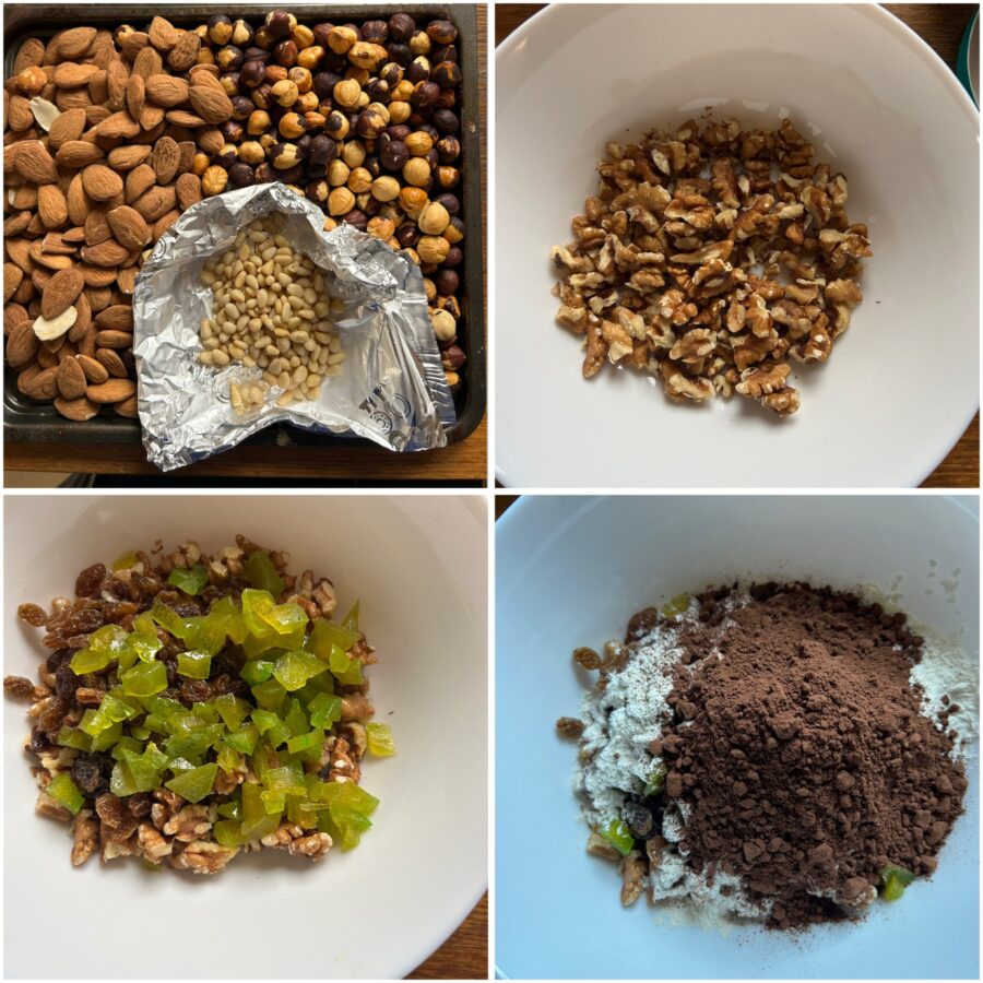 Hak de walnootkernen fijn en doe ze in een kom samen met de rozijnen, die je 10 minuten in lauw water hebt laten weken en uitgeknepen. Voeg de gekonfijte schillen, de bloem, cacao, geroosterd gedroogd fruit en de aroma’s toe, samen met de geraspte sinaasappelschil, en meng alles goed door elkaar.