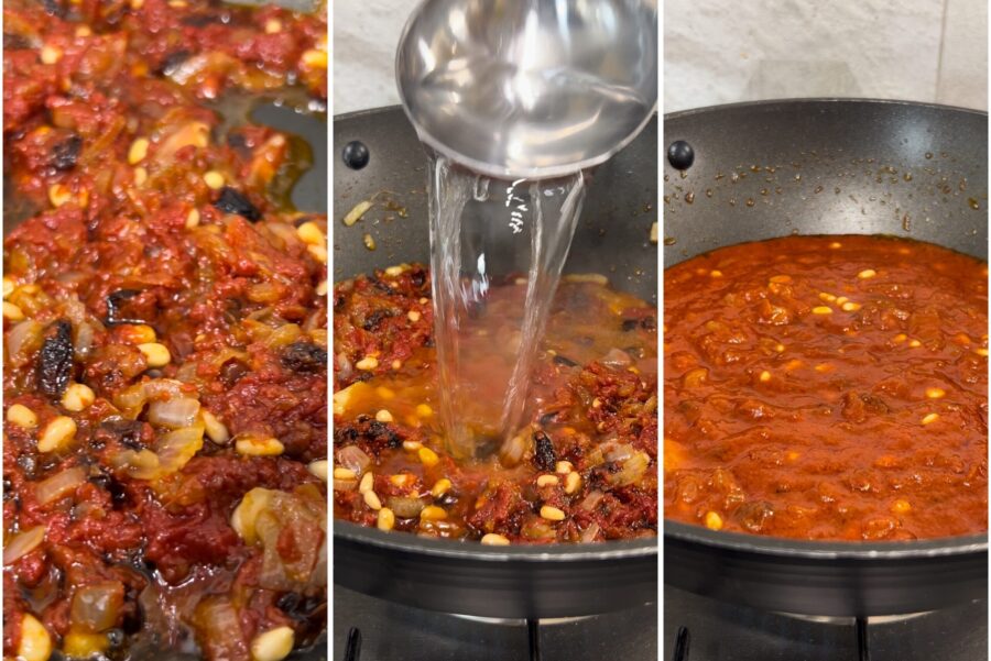 Als de ansjovis uit elkaar gevallen is, voeg je de pijnboompitten, de rozijnen en kort daarna het tomatenconcentraat toe.